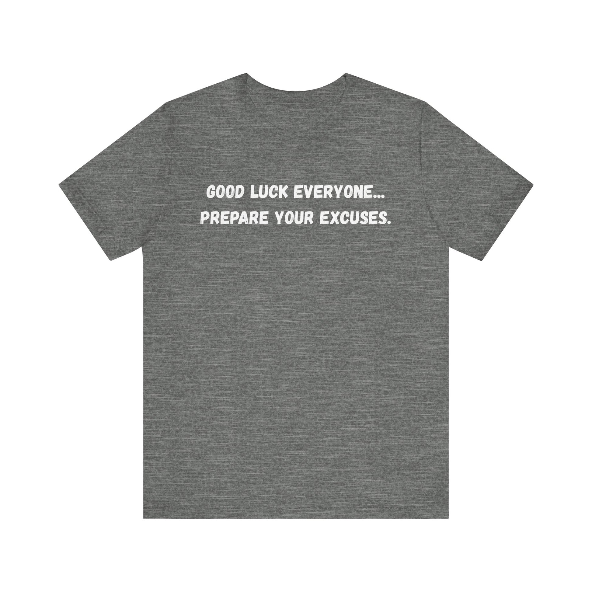 Good Luck Everyone...Prepare Your Excuses - Funny catchphrase tee | sarcastic humor shirt | funny text apparel | gag gift idea