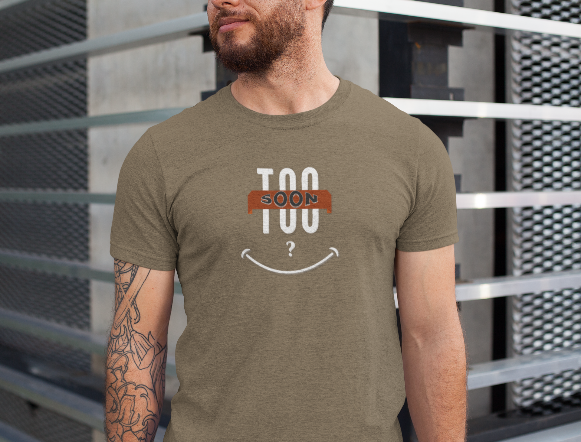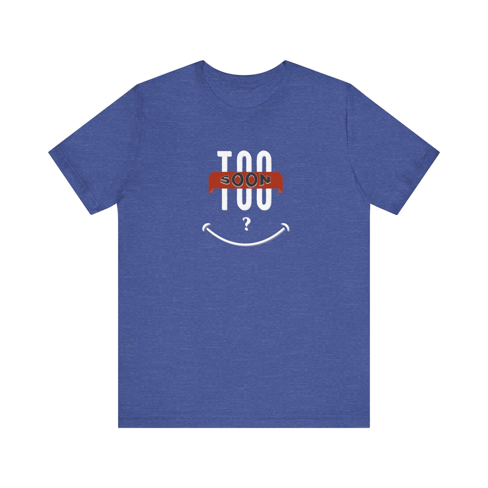 "Too Soon?" - Funny Graphic Shirt for Casual Wear, Gift for Friends, Humorous Slogan Tee, Party Attire, Everyday Humor